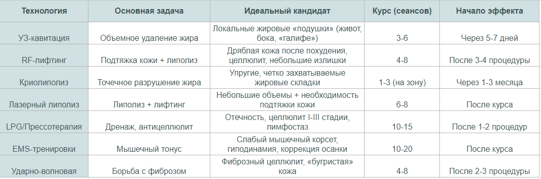 Современный тренд в эстетической медицине — составление персонализированных программ, где методы коррекции фигуры комбинируются для синергетического эффекта. Это позволяет добиться большего за меньшее время. Классические связки: